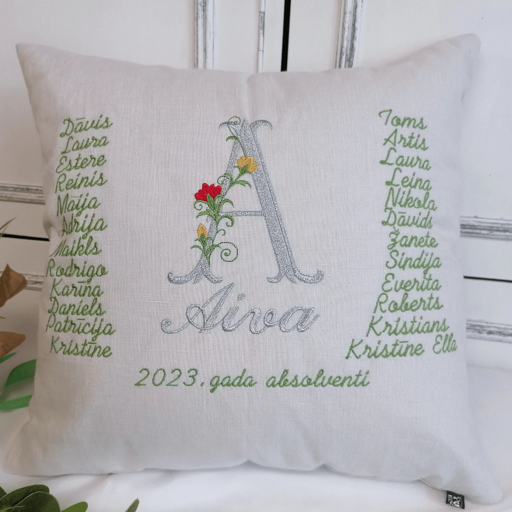 Pillow with removable cover, personalized with pupil names, big teachers first name letter, hers name and graduation date embroidery.