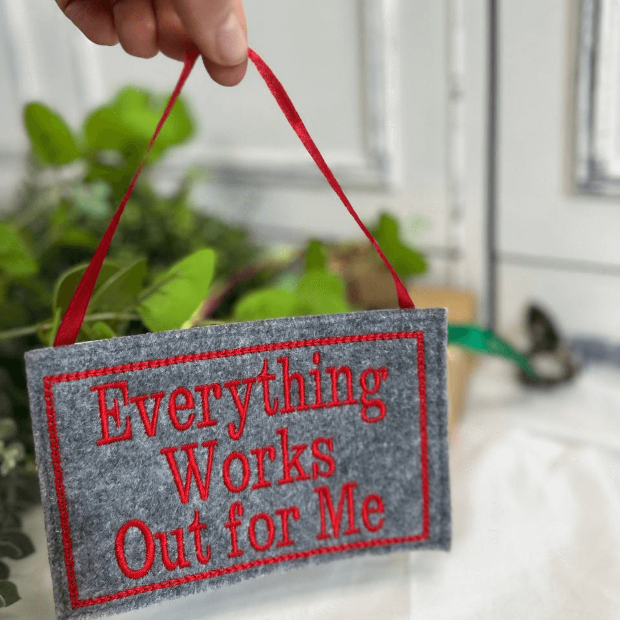 The “Everything Works Out for Me” Embroidered Affirmation Hanging is designed to support a peaceful, optimistic mindset — especially during uncertain or stressful moments. Made from soft grey fleece and embroidered in bold red thread, it brings quiet reassurance into your space while gently activating positive focus.