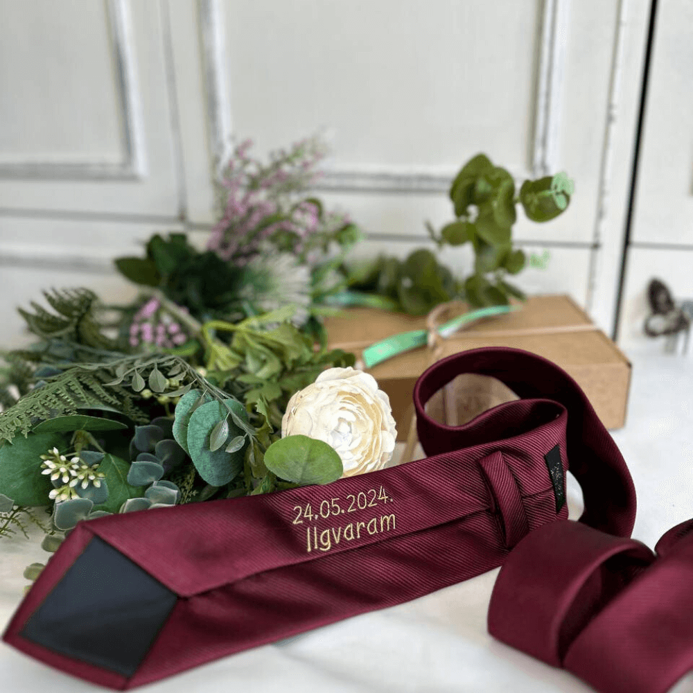Atlass fabric handmade necktie with date and name embroidery on back.