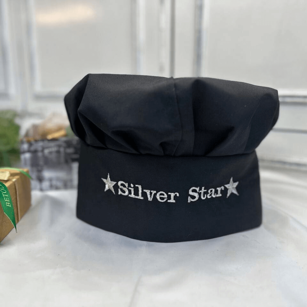 A chef's hat for a prefect look in kitchen with embroidery. If you don't want embroidery as in picture, write your text;